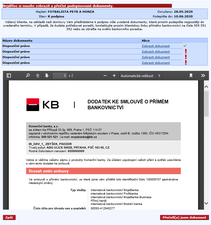 Obrazovka se může měnit a zobrazovat různé akce v souvislosti s typem operace tzn. jedná-li se o podpis dokumentu, zobrazení již podespaného dokumentu nebo zobrazení dokumentu určeného k přečtení bankou.